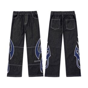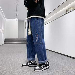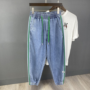 2022年新款侧边条纹松紧腰牛仔裤男宽松抽绳弹力束...