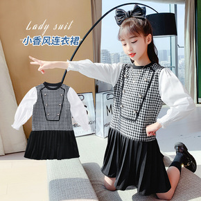 巴拉巴拉女童泡泡袖拼接格子裙新款秋季2021年洋气...