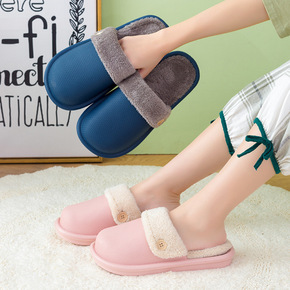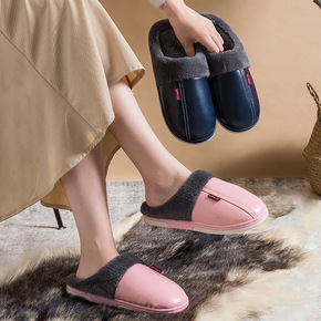 秋冬情侣款家居棉拖鞋室内防水pu皮棉鞋加厚毛绒保暖...