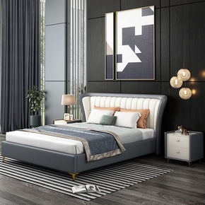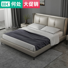北欧真皮床ins1.8米主卧双人床牛皮软包靠背现代...
