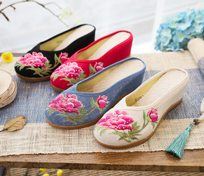 拖鞋 浅语 亚麻牡丹绣花布鞋 圆头平凉拖2春夏新款...