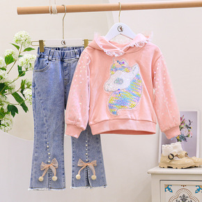 女童连帽卫衣2021秋新女孩网纱儿童珠片卡通小马上...