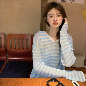 .秋冬韩版新款羊毛衫女套头宽松连帽卫衣条纹帽衫针织...
