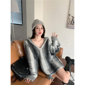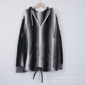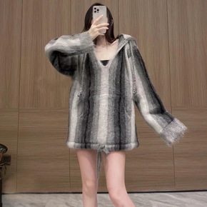 法式CE家灰色渐变马海毛连帽毛衣女宽松2021秋抽...