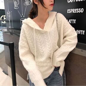 韩版2021年秋冬新款百搭麻花宽松纯色休闲连帽针织...