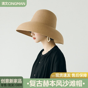 复古赫本风遮阳帽大帽檐帽夏季出游防晒度假沙滩帽可折...