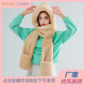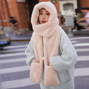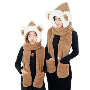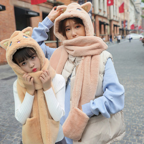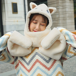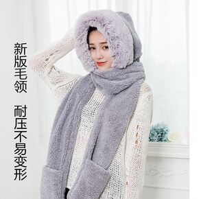 韩国秋冬季加厚双层情侣围巾帽子手套一体三件套毛绒保...
