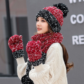 保暖手套围巾帽子3件套 女士冬天拼色加绒防寒保暖围...
