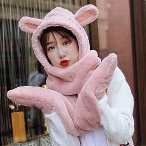 韩版秋冬纯色兔耳朵围巾帽子手套一体三件套冬季加厚加...