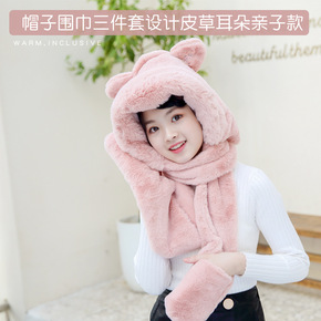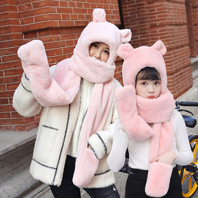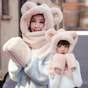 秋冬季韩版保暖亲子帽子围脖手套一体三件套围巾披肩毛...