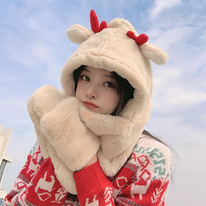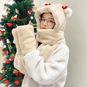 帽子围巾一体女秋冬季圣诞鹿角甜美可爱百搭潮冬天手套...