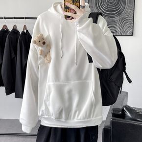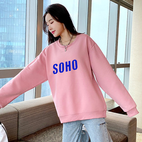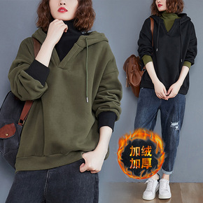 日韩2021秋冬新款休闲纯黑色加绒加厚宽松套头卫衣...
