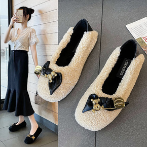 羊羔毛豆豆鞋女冬季2021新款平底蝴蝶结加绒保暖一...