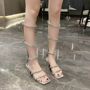 白色长靴夏季2022新款网红罗马镂空长靴高筒水钻一...
