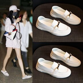 2022夏季新款懒人鞋白色休闲乐福鞋真皮女软底护士...