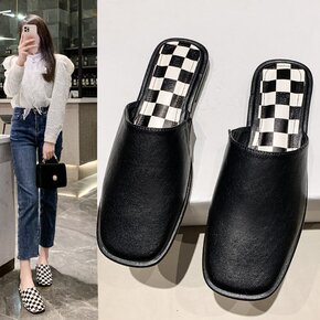 平底包头半拖鞋女外穿2022春季新款黑白棋盘格时尚...