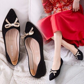 浅口尖头平底单鞋女水钻四季平跟黑色工作鞋小码33大...