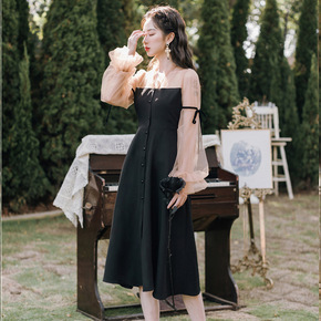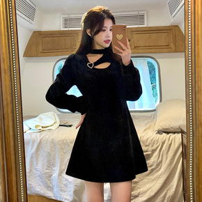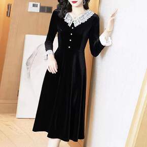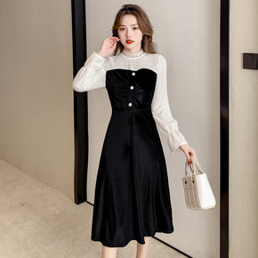 黑色金丝绒连衣裙秋冬2022春新款洋气礼服裙子大牌...
