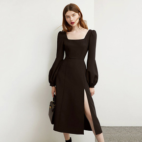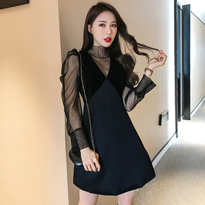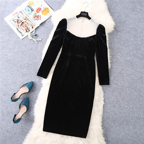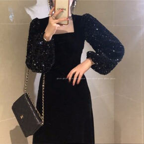 韩chic秋冬闪闪亮片拼接袖方领开叉丝绒连衣裙年会...