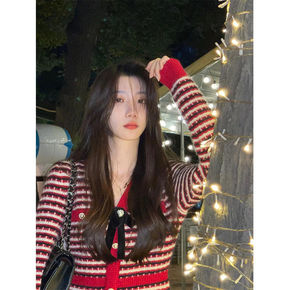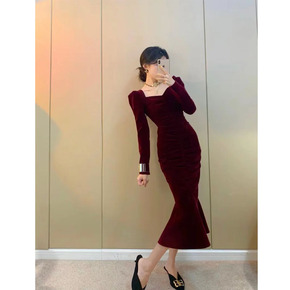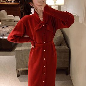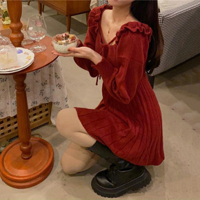 针织连衣裙女春季2022新款法式收腰红色年会战裙方...