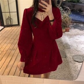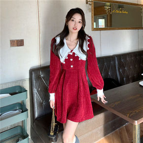 灯芯绒红色连衣裙女2022秋冬新款年会战袍拼接娃娃...