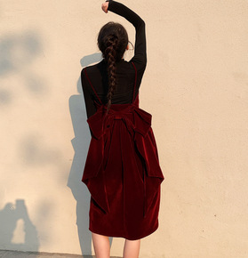 年会礼服酒红丝绒露背大蝴蝶结生日宴会吊带连衣裙女...