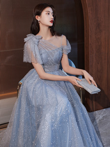 抹胸蓝灰色公主裙时尚伴娘服蓬蓬裙仙女裙浅紫色中长款...