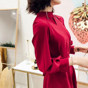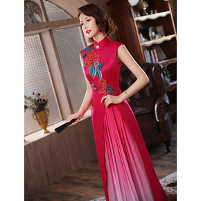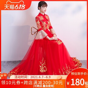 红色走秀长款主持人晚礼服女2021新款中国风旗袍中...