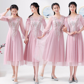 缎面伴娘服2021新款春秋粉色仙气长款姐妹团晚礼服...