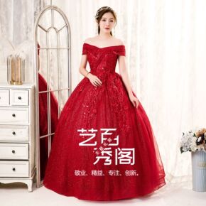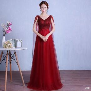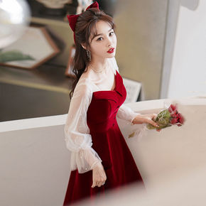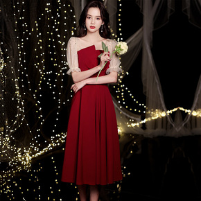 结婚新娘敬酒礼服小个子优雅年会气质红色拼接网纱中长...