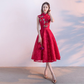 新娘红色敬酒服 2021新款复古蕾丝修身礼服裙中国...