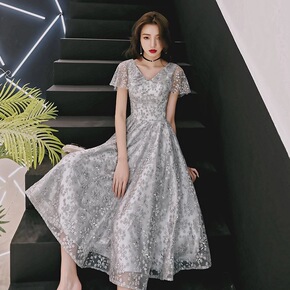 灰色中式宴会晚礼服女2021新款秋季年会礼服裙端庄...
