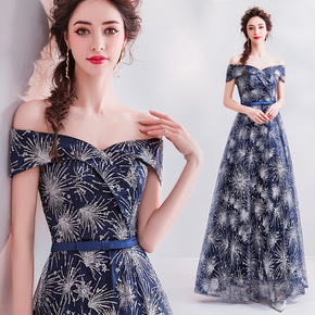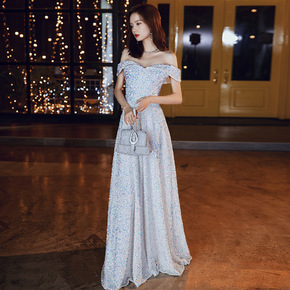 一字肩晚礼服裙女宴会气质气场女王性感亮片年会主持人...