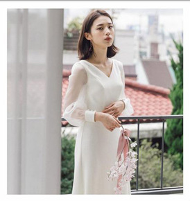法式轻婚纱超仙简约白色缎面新娘出门纱V领长袖仙派对...
