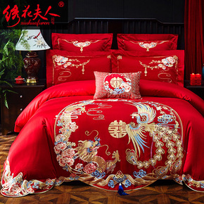 长绒棉新婚庆四件套大红色全棉刺绣结婚床上用品龙凤喜...