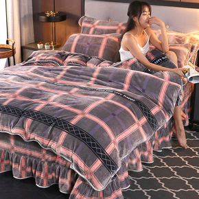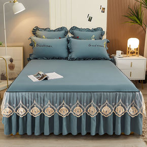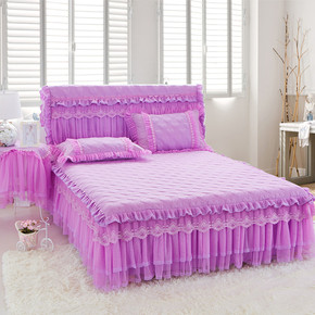 夹棉加厚床裙三件套床套罩1.8蕾丝边枕套床单紫色床...