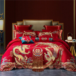 120支婚庆四件套大红刺绣龙凤长绒棉结婚房陪嫁礼六...