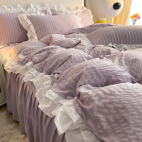 韩式浅紫色床上四件套纯色大花边双人被套床裙少女宿舍...