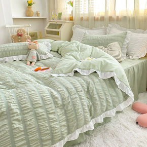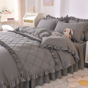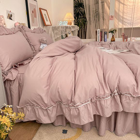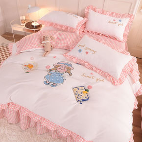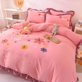 少女粉水洗棉床裙四件套网红公主风床单被套简约学生宿...