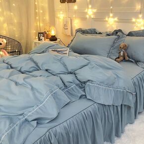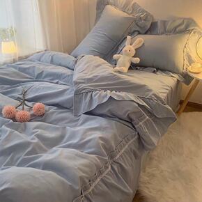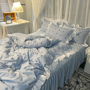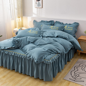 韩式大气蓝色公主风四件套水洗棉荷叶花边被套纯色床裙...