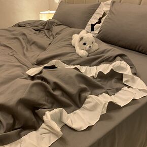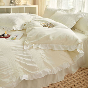 ins公主风奶白花边被套床上四件套少女心纯色床单床...