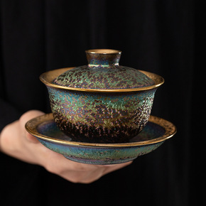 陶瓷窑变七彩孔雀鎏金建盏茶碗大号三才盖碗茶具带证书...
