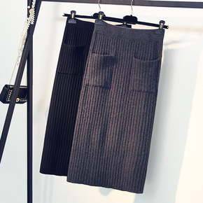 韩国东大门女士暗坑条双口袋高腰包臀针织中长半身裙开...