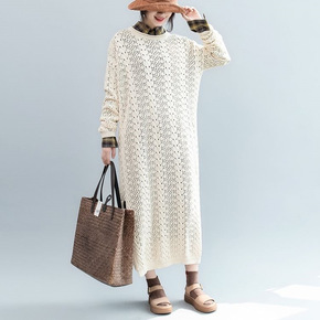 大码女装长款毛衣裙过膝秋装女2021新款开叉文艺镂...