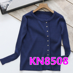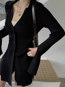 2021秋季新款圆领斜襟排扣开叉针织修身长袖女士打...