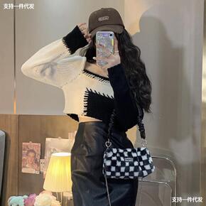 衬衣马甲两件套韩版拼色千鸟格提花领毛衣背心女宽松百...