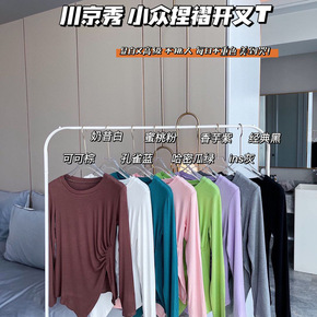 川京秀小众捏褶开叉T恤 女圆领修身型春秋季长袖纯色...