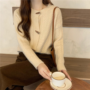 韩版秋冬新款2022圆领开衫针织毛衣外套女宽松两面...