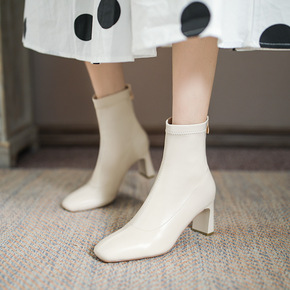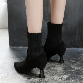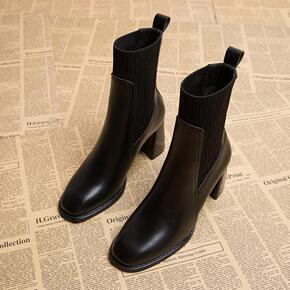 靴子女2021年春秋款瘦瘦袜子靴高跟短靴粗跟中跟马...