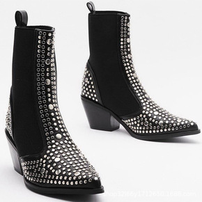 2021新款尖头粗跟高跟鞋小码313233靴子女裸...
